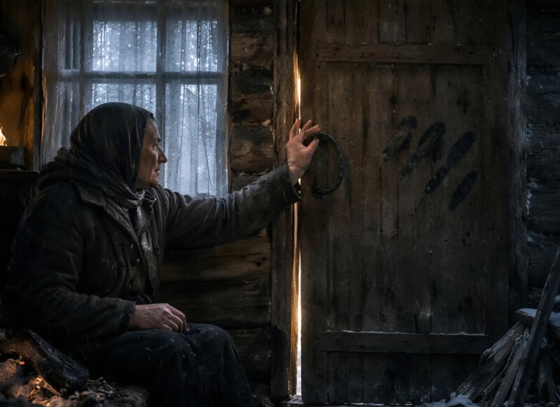 Η γιαγιά καθόταν δίπλα στη σόμπα και ζέσταινε τα παγωμένα της χέρια, ακούγοντας τον άνεμο να χτυπά τους τοίχους. Και ξαφνικά — τρία δυνατά χτυπήματα στην πόρτα.